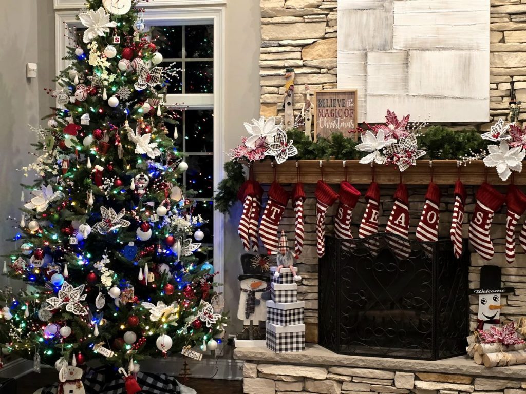 In contrast, the family room and kitchen are where nostalgia takes center stage. Here, we layered in cherished family treasures, well-loved collectibles, and a joyful mix of red, white and black & white plaid. A charming collection of handcrafted snowmen cutouts tied the entire space together with personality and heart.
