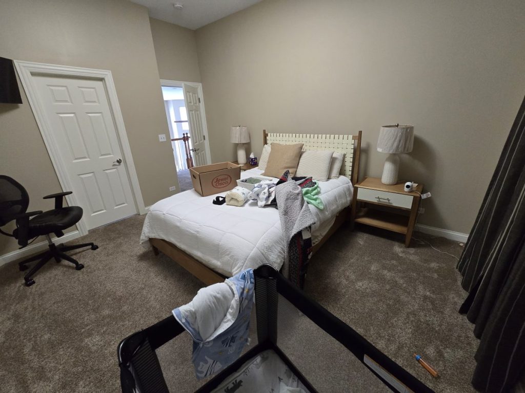 The other guest room, while still cozy, trended a bit cooler and more sophisticated with greige walls, upholstered bed, leather recliner and wood tiled 3-drawer dresser nightstands. This room was only missing art and accents to really show off the client’s personality.